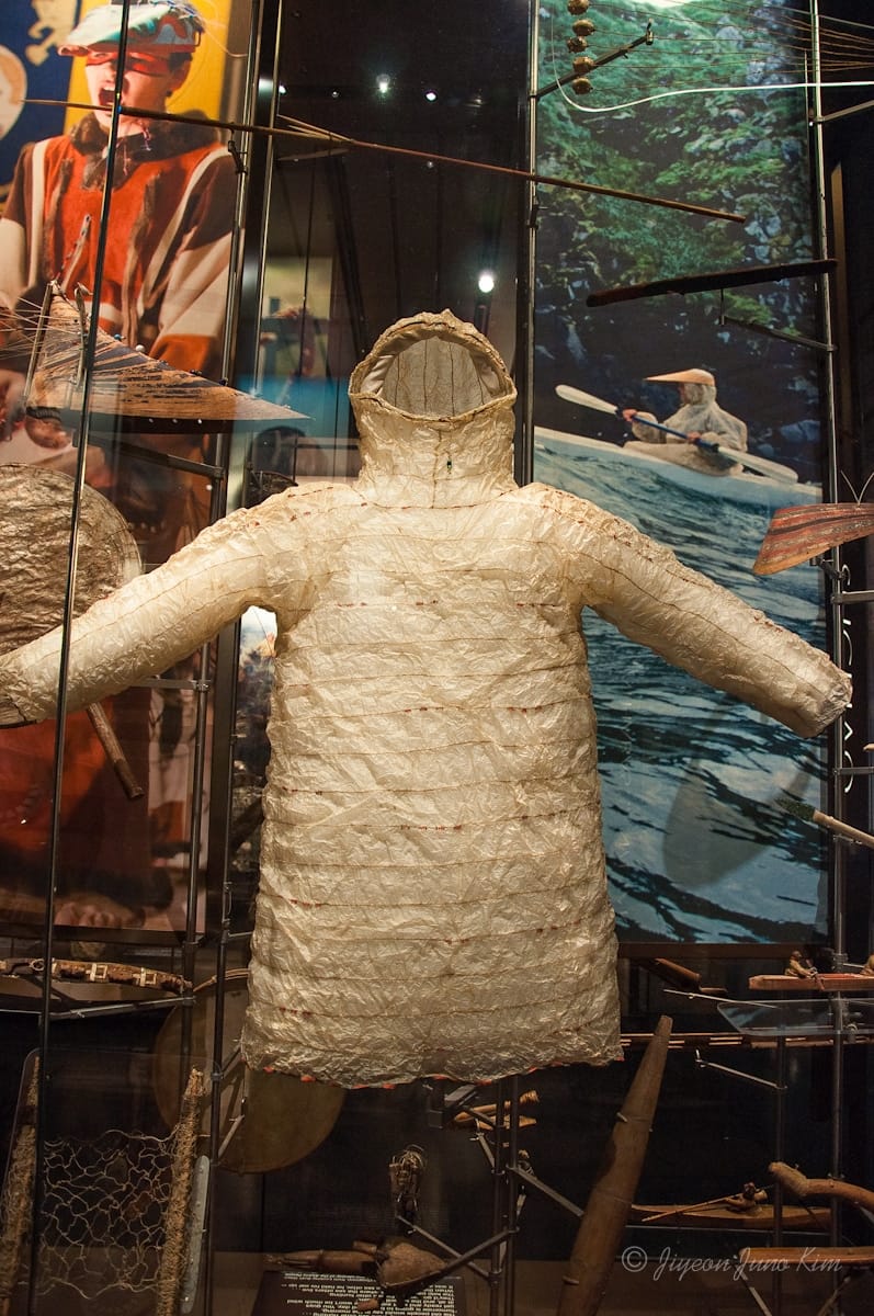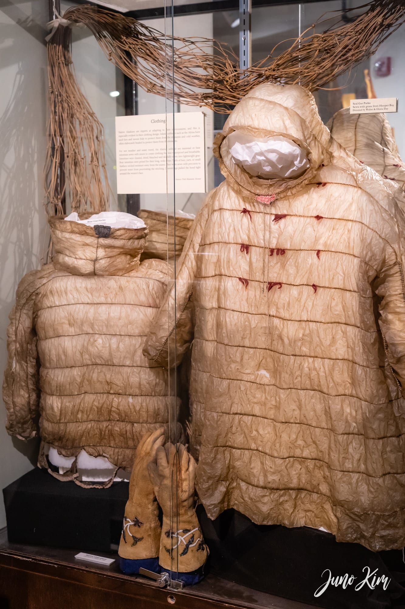 "Gut skin parka" vo Valdez Museum x "Gut skin parka" v Anchorage Museum, Aljaška